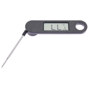 Et termometer af rustfrit stål som er perfekt til at måle indertemperaturen på madvarer under tilberedningen. Termometeret kan måle temperaturer mellem 50 og 200 grader Celsius. Batterier medfølger.