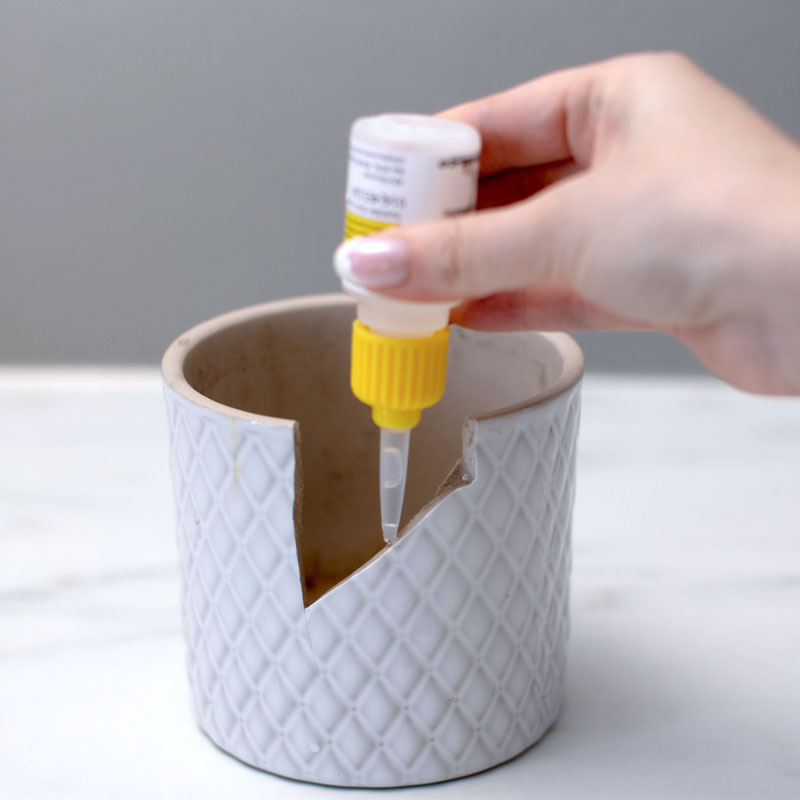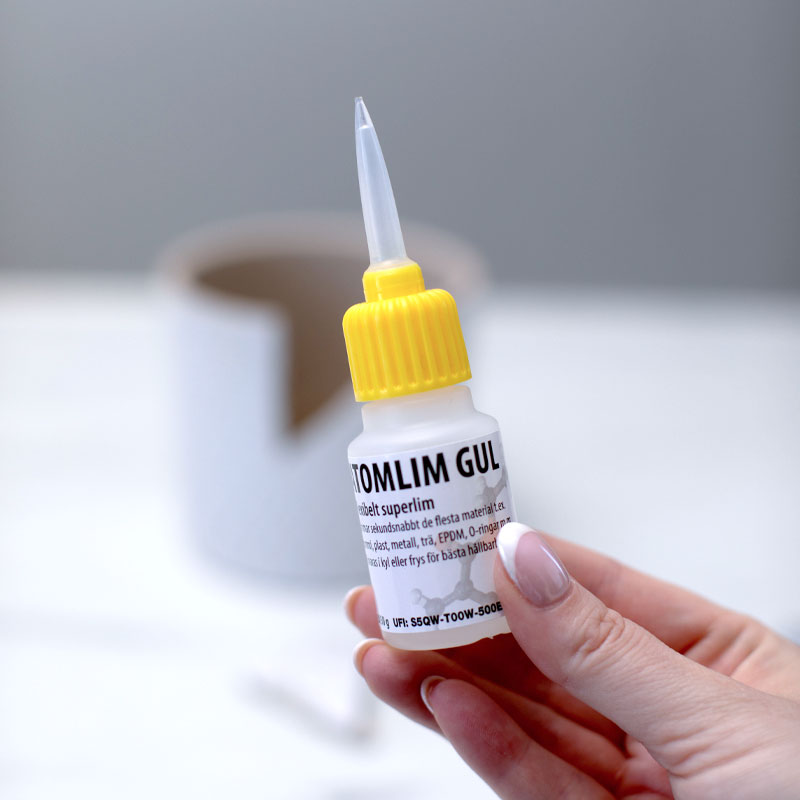 - Løsn det gule låg. Skær det yderste stykke af spidsen så limen kan flyde ud.