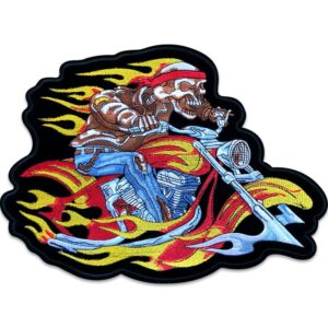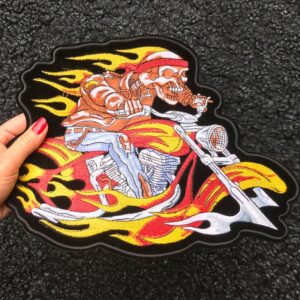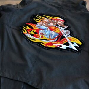 Hell Rider er et større strygemærke, der forestiller en levende død på MC med ild og flammer. Det er et utroligt smukt broderet strygemærke, som du kan stryge fast på bagsiden af jeansjakken eller på en taske. Strygemærket måler ca. 30,5 x 22,3 cm.