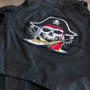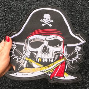 Cool symærke som forestiller et piratkranium med sørøverhat og sabler. Mærket har en størrelse på 24 x 22 cm, og dette mærke skal sys fast.
