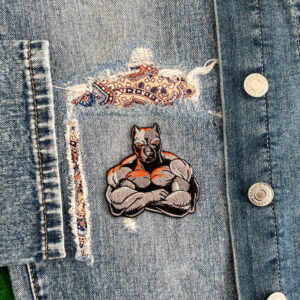 Her har du et cool strygemærke i form af en pitbull bodyguard, der fastgøres på tøjet med varmen fra et strygejern. Mærket måler 7 x 6,7 cm, og det har en varmeaktiveret bagside, som sætter sig fast på tøjet. Denne pitbull bodyguard kan bruges som lap til at reparere små huller i tøjet. Du kan også bruge strygemærket til at give en gammel taske eller kasket et nyt look.